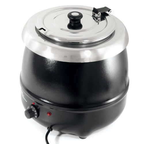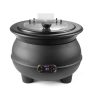 Crni Bain-marie Hendi zapremnine 8 litara. S unutarnjom posudom od nehrđajućeg čelika i poklopcem na šarkama. Opremljen regulatorom snage. Uključuje magnetske držače za naziv jela u posudi.