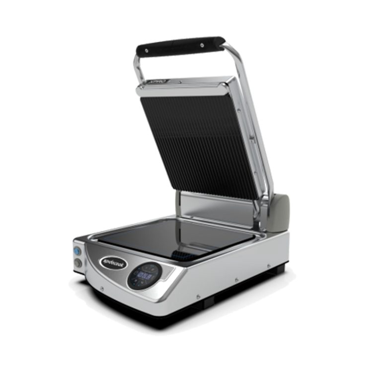 Jednostruki digitalni grill s rebrastom crnom gornjom pločom i glatkom crnom donjom pločom-Spidocook