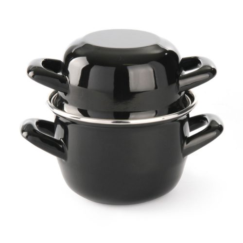Lonac s poklopcem za pripremu i serviranje školjki koji se može koristiti na plinskim štednjacima. Kvalitetan email te obrub od nehrđajućeg čelika.